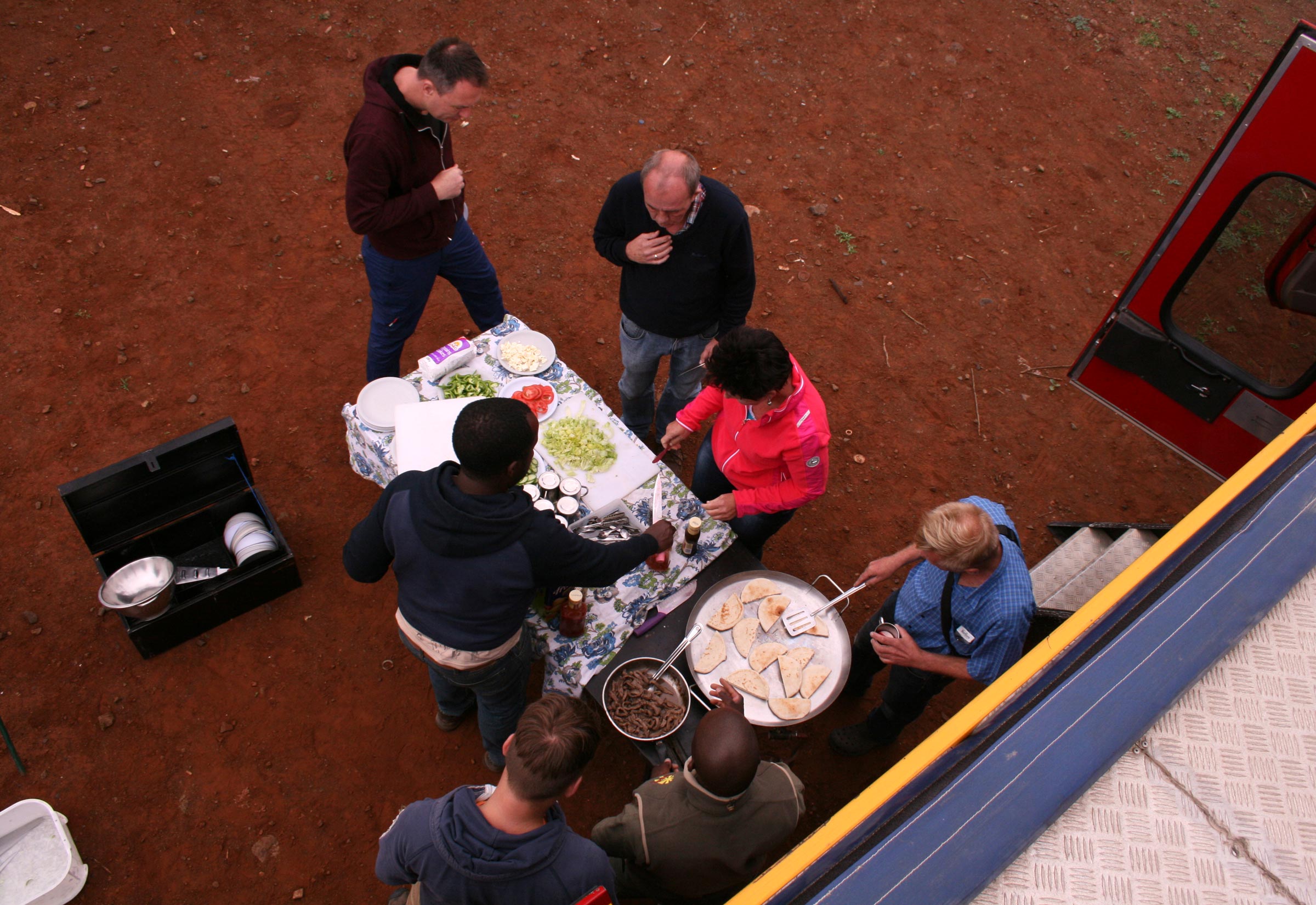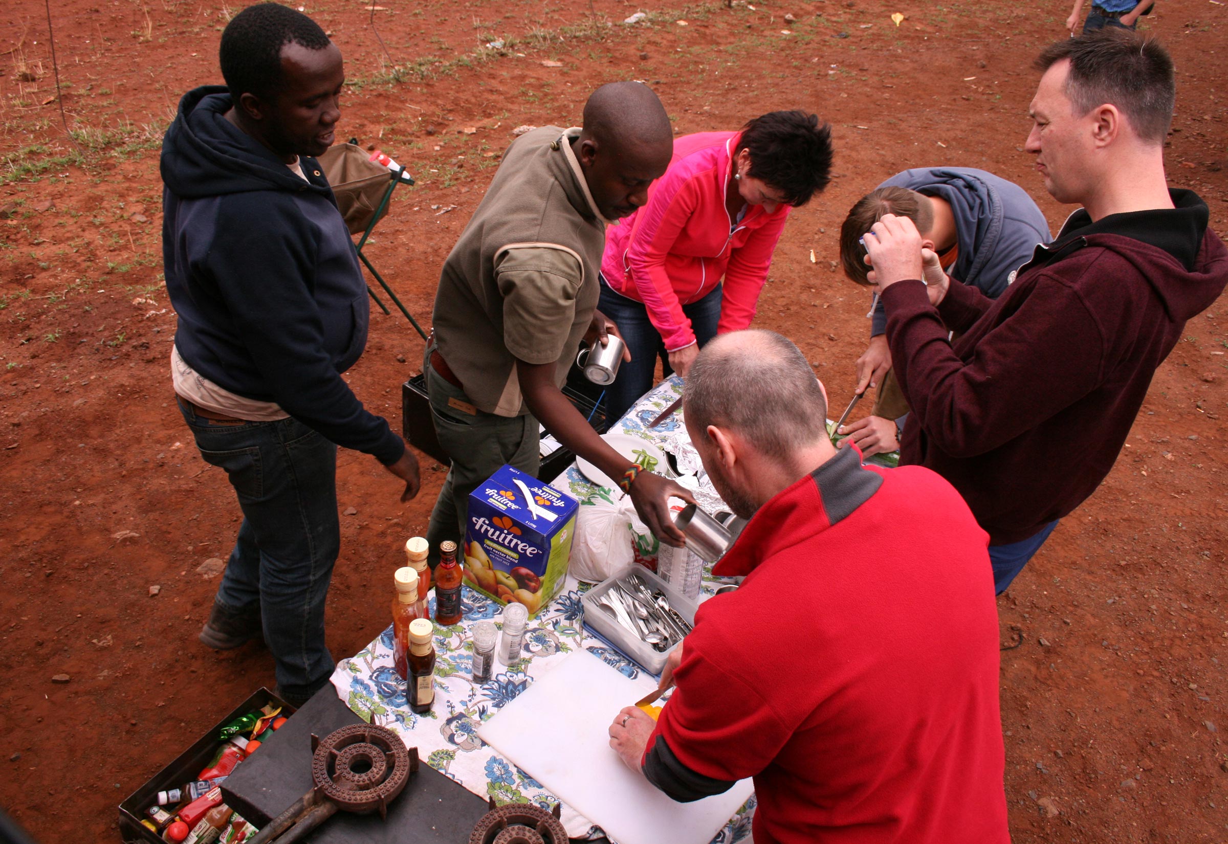 Unsere Guides zaubern bei wenig Beleuchtung wieder ein leckeres Abendessen für uns, es wird Maisbrei mit Weißkohl und Gulasch serviert. Wir gehen danach zeitig schlafen, da am nächsten Morgen unsere Fußpirsch ansteht.