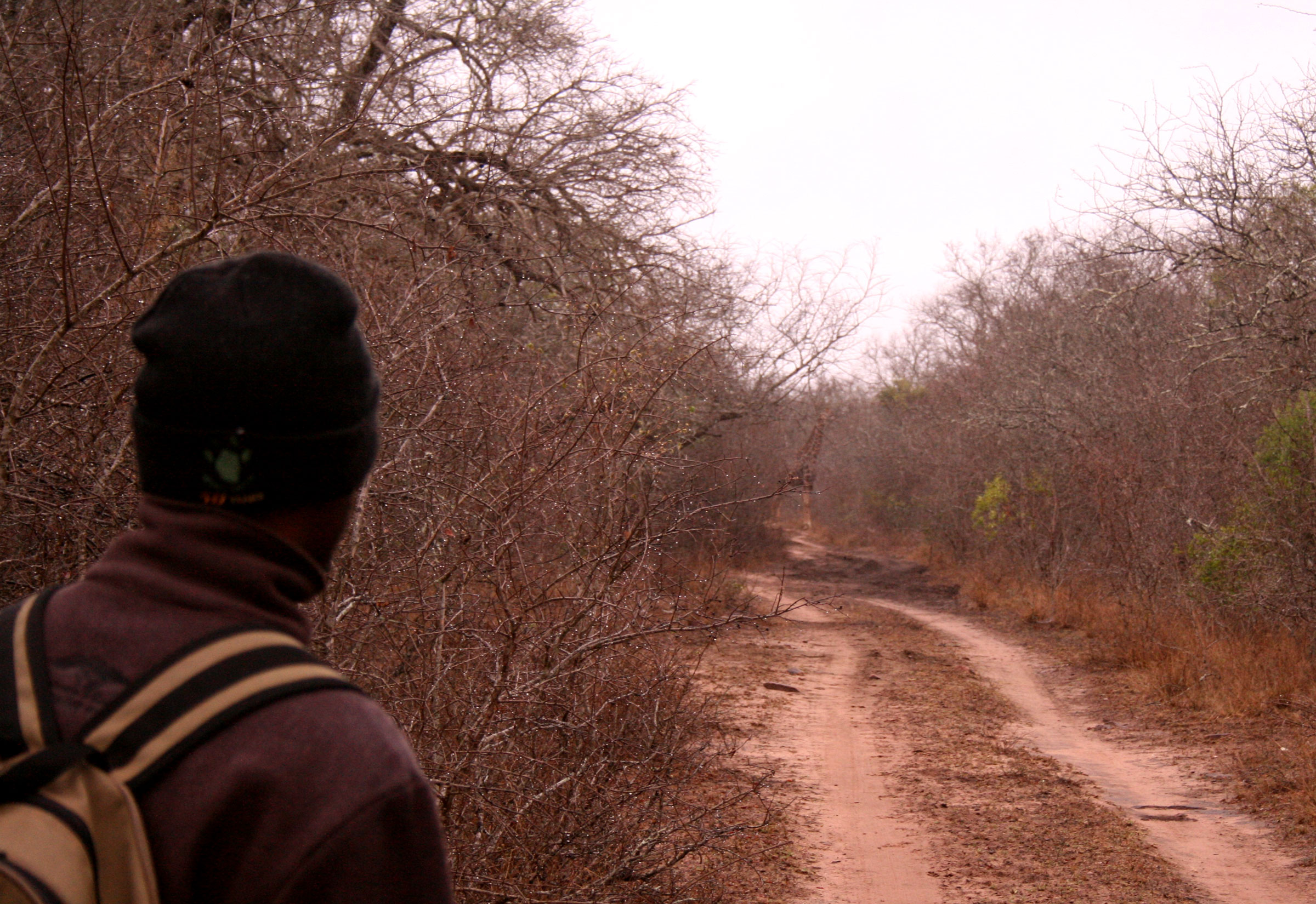 Wir gehen zwei große Gatter, hinein in das abgezäunte Nashorngebiet. Hier hatten wir am Abend zuvor schon die ersten beiden Nashörner gesehen. Mir ist sehr mulmig zumute, immerhin könnten wir nun jeden Moment einem der imposanten Tiere begegnen. Erst als wir das Tor hinter uns schließen, beruhigt sich mein Atem wieder. Der Ranger ist erstaunlicherweise nur mit einem Stock „bewaffnet“. Er erklärt uns, dass die ausführlichen Pirschwanderungen nur noch in den weniger gefährlichen Gegenden des Parks angeboten werden. Aber auch hier müssen wir Augen und Ohren offenhalten. Zu den ersten Tierspuren, die wir entdecken, gehört die Spur einer Afrikanischen Python bei einem Erdloch.