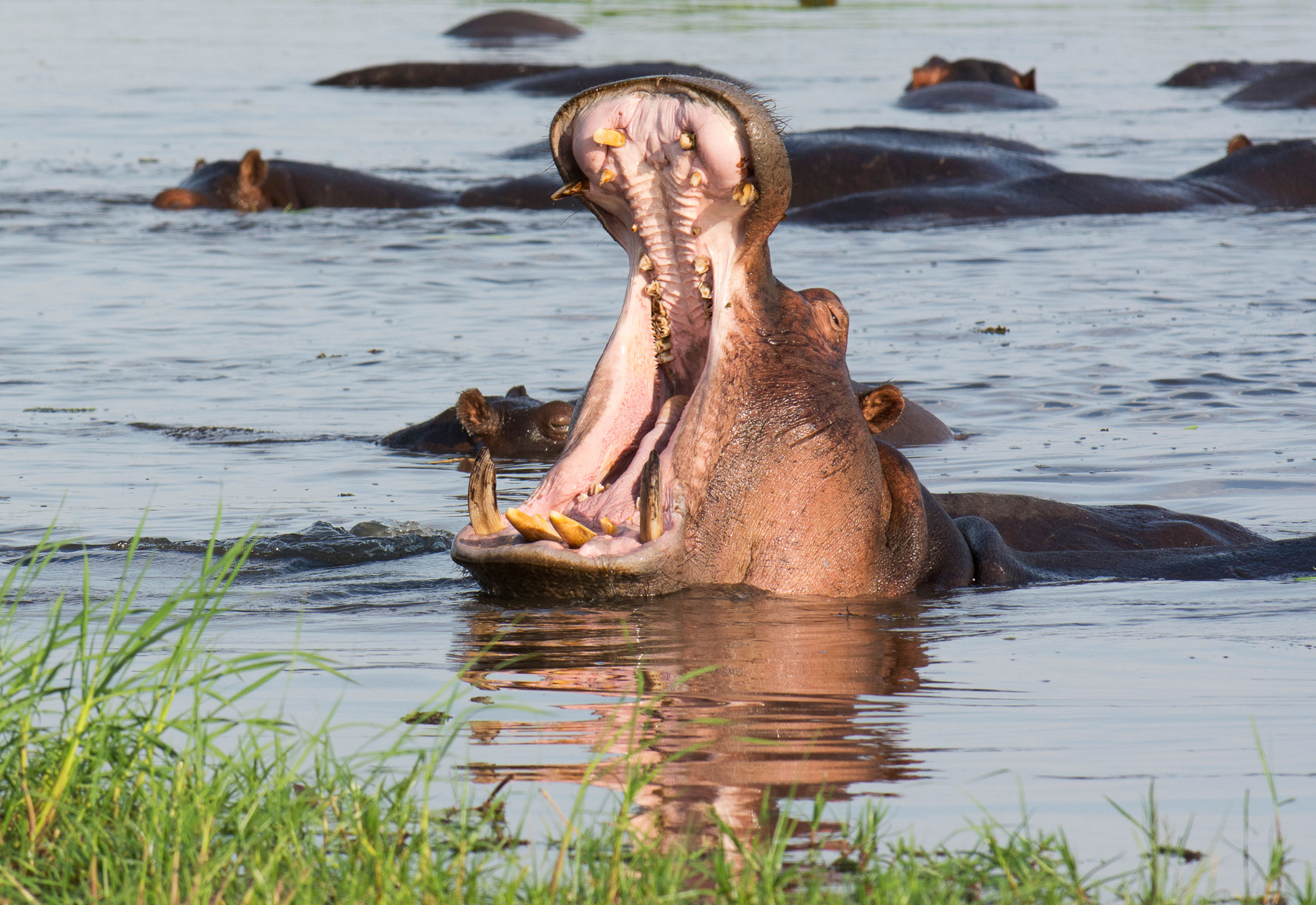 Für uns steht heute eine Pirschfahrt auf dem Programm. "Unsere Gäste haben die Wahl, ob es nach Khwai oder hinein ins Moremi Wildreservat geht", erklärt unser Guide. "Wir versuchen immer dorthin zu fahren, wo wir mit den besten Tierbeobachtungen rechnen." An diesem Nachmittag geht es nach Khwai. Wir stoppen zuerst an einem vertrockneten Baum, auf dessen von der Sonne ausgezehrten Ästen sich farbenprächtige Karminspinte versammelt haben. Dann kommen wir zu einer Gruppe Flusspferde, die uns einen großen Gefallen tun. Wie oft habe ich mit dem Finger auf dem Auslöser bei den Hippos gewartet, dass eines von ihnen endlich mal das Maul aufsperrt. Wenn es dann überhaupt passierte, war es meist im Gegenlicht. Heute ist es anders. Die Tiere gähnen um die Wette. Und wir stehen auf der richtigen Seite, so dass die warme Nachmittagssonne den Flusspferden bis tief in den Rachen leuchtet. Fotoherz, was willst Du mehr? Doch es gibt noch mehr zu sehen, sogar eine echte Rarität. Wir kreuzen den Weg einer Gruppe der vom Aussterben bedrohten Wildhunde. Ebenfalls im schönsten Abendlicht spielen sie rund um unser Safarifahrzeug. Nachdem wir schon in Savuti Wild Dogs gesichtet hatten, ist das nun die zweite Begegnung mit diesen flinken Tieren auf meiner Botswana-Reise. Bis ich zum ersten Mal Wildhunde in freier Natur zu sehen bekam, mussten elf Safari-Jahre vergehen. Und nun sehe ich sie gleich mehrfach.