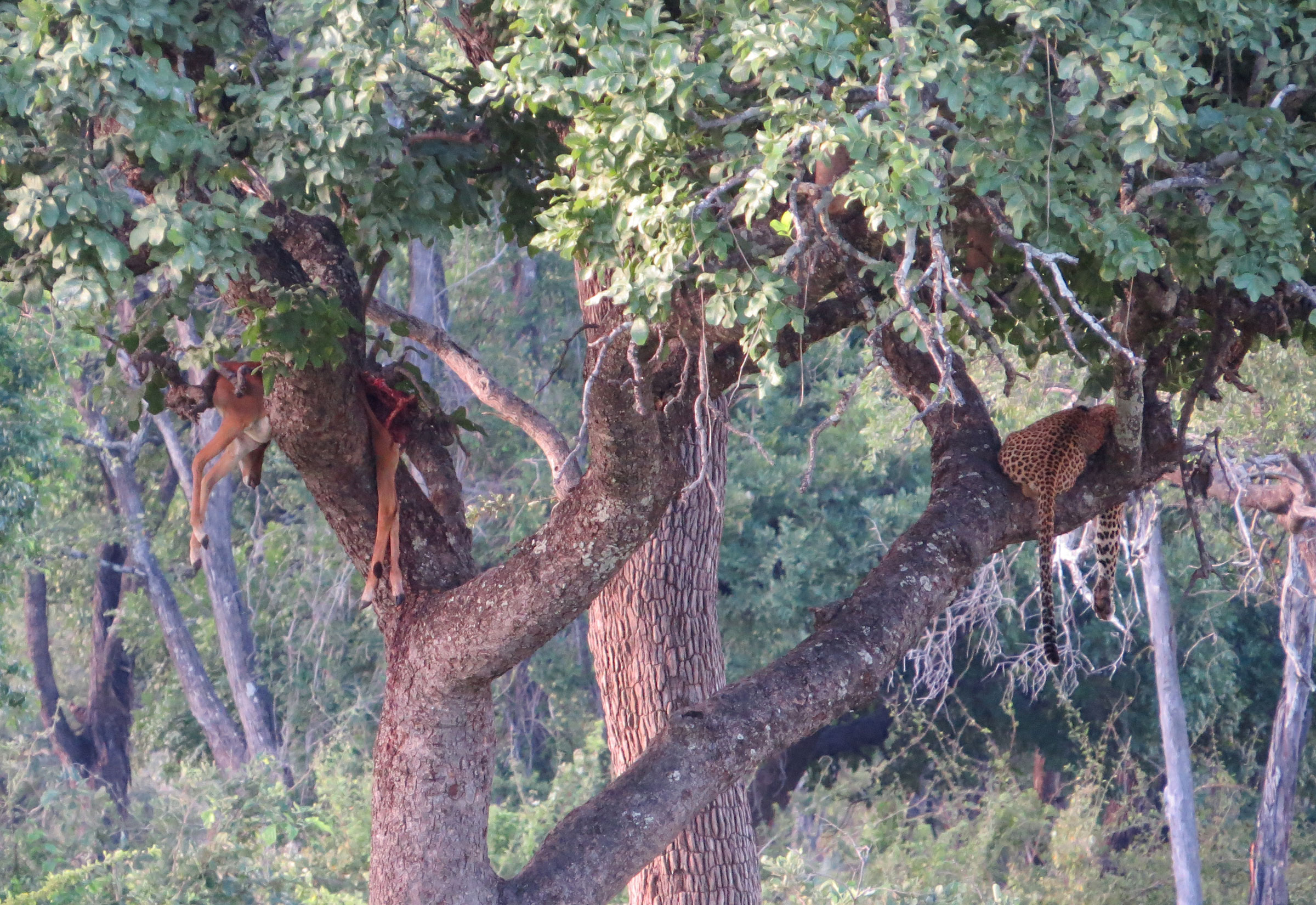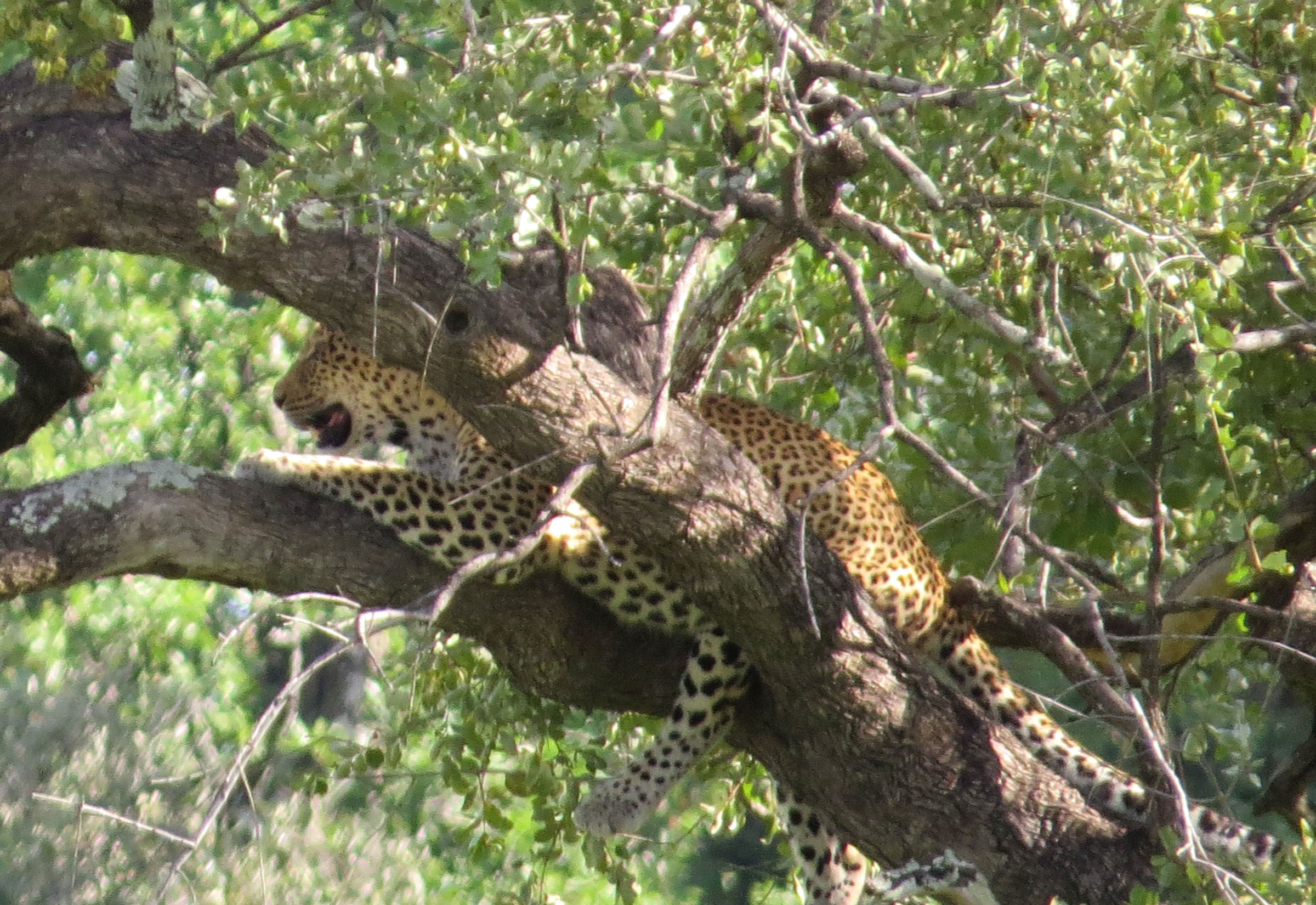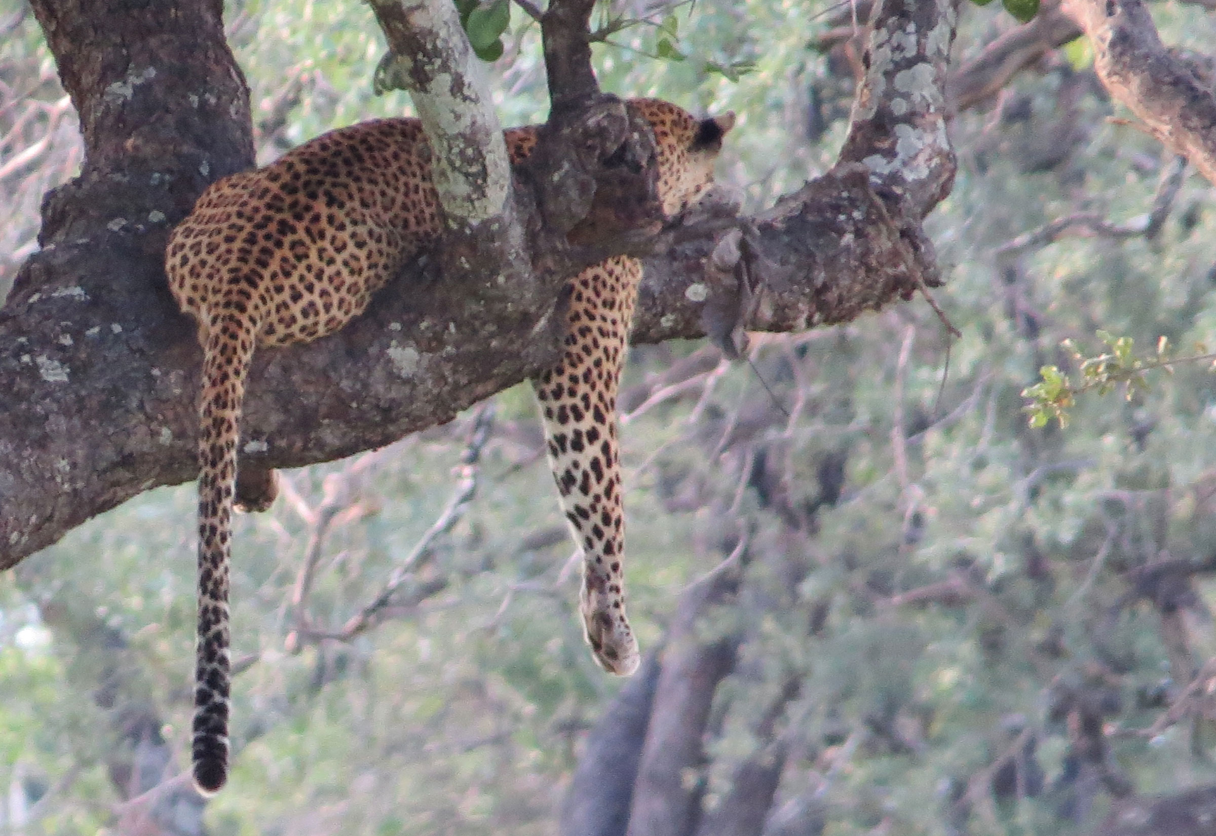 Der Dauerbrenner bei den Pirschfahrten ist aber ein Leopard, der bei der ersten Pirschfahrt seine Beute, ein Impala, in einen Baum geschleppt hat. Für die nächsten zwei Tage hängt er nun eigentlich ständig sprichwörtlich am gleichen Platz herum. Wir fahren bei jeder Pirschfahrt mehrmals vorbei und treffen ihn fast immer an. Auch an anderen Tieren mangelt es nicht und wir kommen von jeder Fahrt mit reicher Fotobeute zurück.