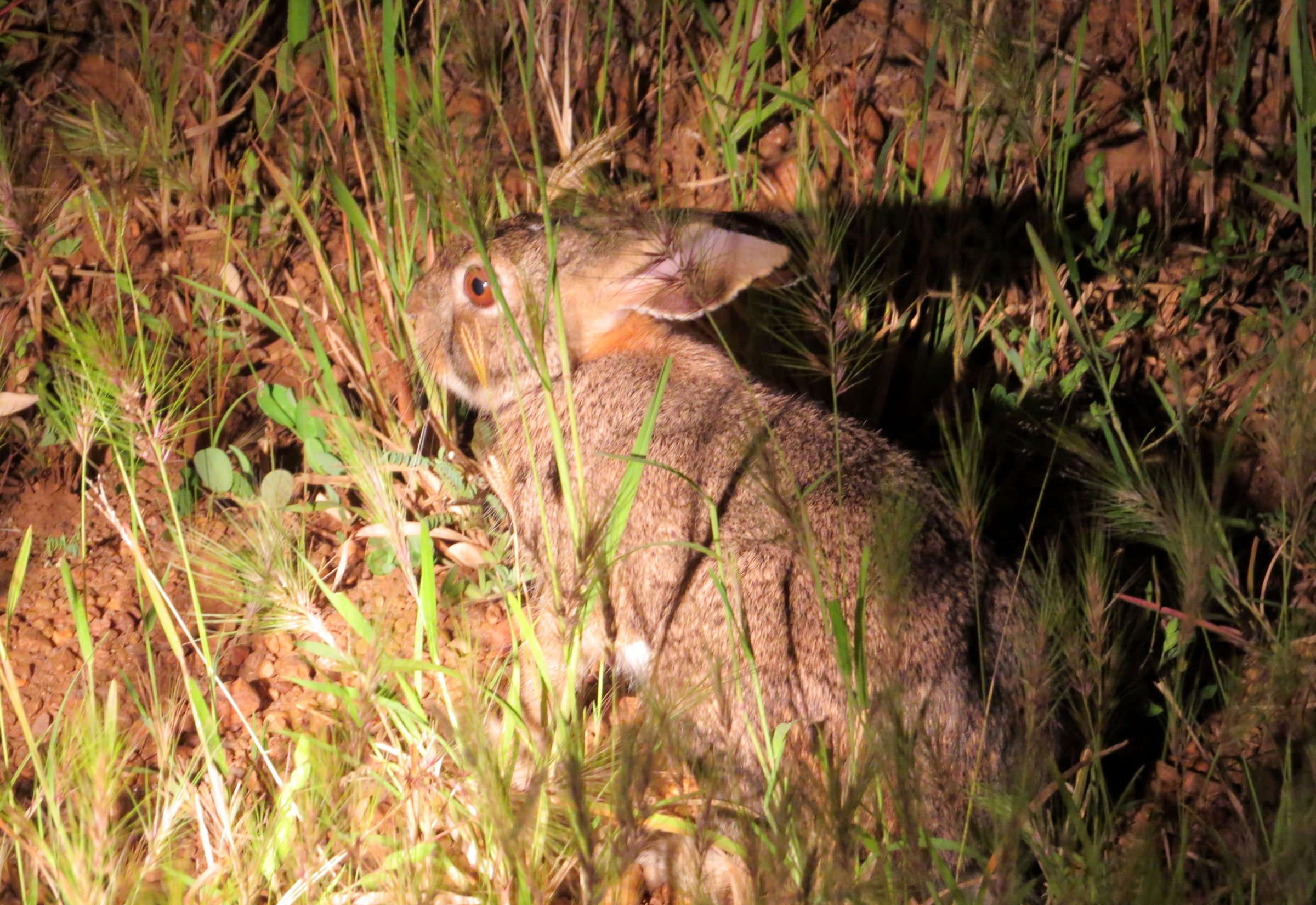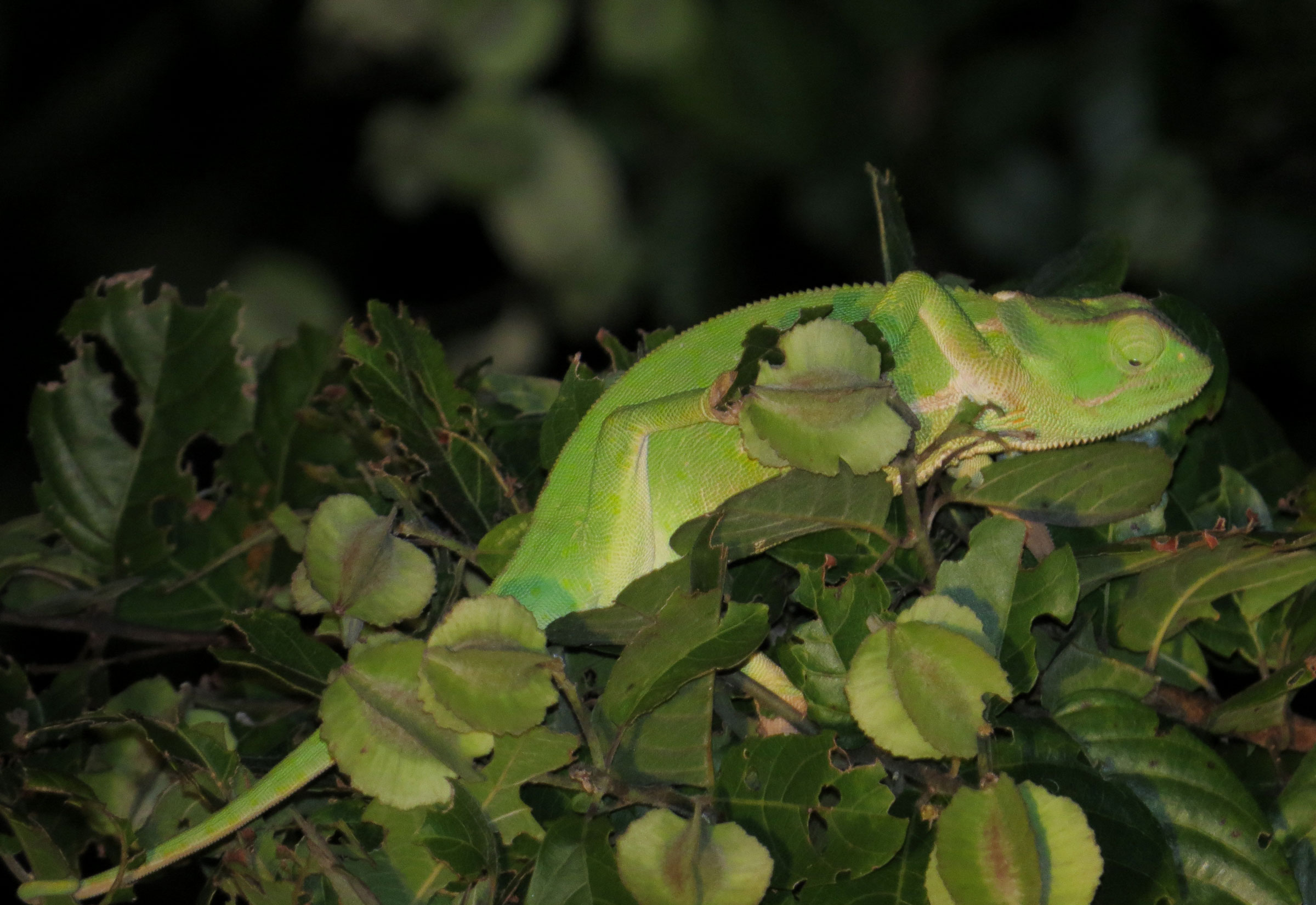 Es sind dementsprechend viele Pirschfahrzeuge unterwegs, trotzdem haben wir auch exklusive Tiersichtungen. Ich hatte bisher noch nie an einer Nachtpirschfahrt teilgenommen und war deshalb sehr erstaunt, was es alles zu sehen gibt. Besondere Highlights sind die Chamäleons, auf die George, unser Nightspotter, spezialisiert ist. Er findet immer welche, oft mehr als eins. Nightspotter fahren zusätzlich zum Guide mit und lassen mit einem Scheinwerfer einen Lichtstrahl durchs Gebüsch streifen, um nachtaktive Tiere aufzuspüren und anzuleuchten. Die Haut der Chamäleons reflektiert das Licht und lässt sie aufblitzen, trotzdem sind sie winzig in den großen Büschen und es gehört ein scharfes Auge und Erfahrung dazu, sie zu entdecken. Wir sehen außerdem Smiths-Rothasen (nicht zu verwechseln mit Kaninchen!), Ginsterkatzen, ein Stachelschwein und natürlich jede Menge Hippos, die sich im Schein der Lampe schnell in den Schatten zurückziehen.
