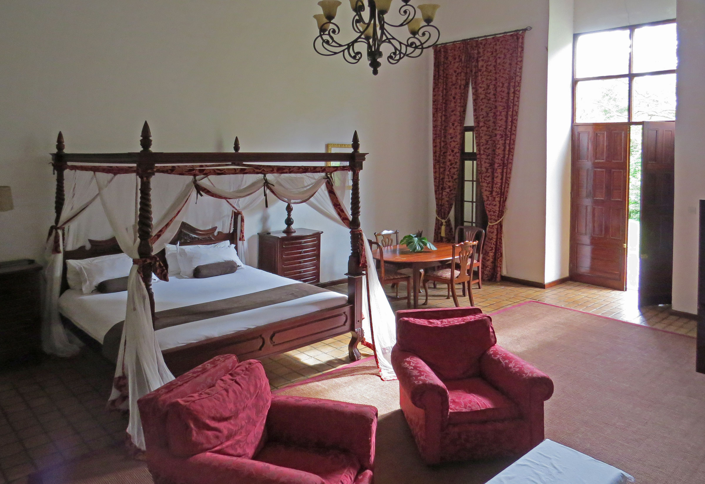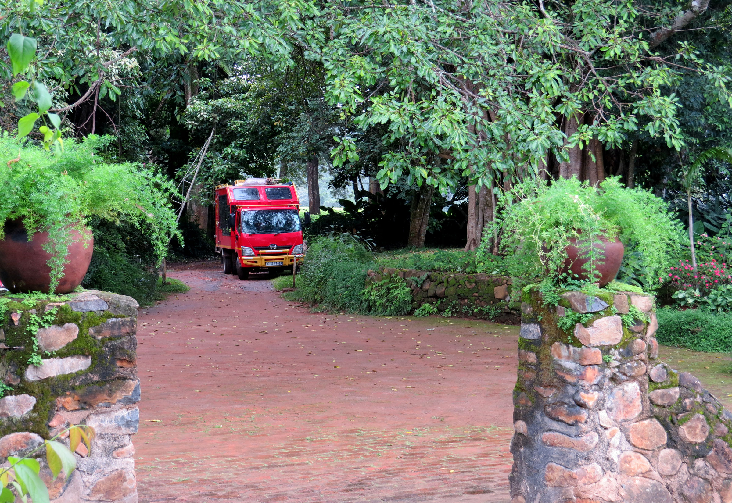 Wir machen erst einmal Mittagspause und beschließen dann, zum Haupthaus der Plantage zu fahren, das gleichzeitig ein schickes, koloniales Gästehaus ist. Svenja hat hier im Huntingdon House schon einmal übernachtet und auch bei ihr war die Teefabrik geschlossen. (Bericht zum Besuch). Es ist wirklich zauberhaft und sehr, sehr englisch hier. Nur der Truck muss draußen bleiben, er passt nicht durch die enge Toreinfahrt. Mit so großen Fahrzeugen haben die Bauherren des Hauses nicht gerechnet.