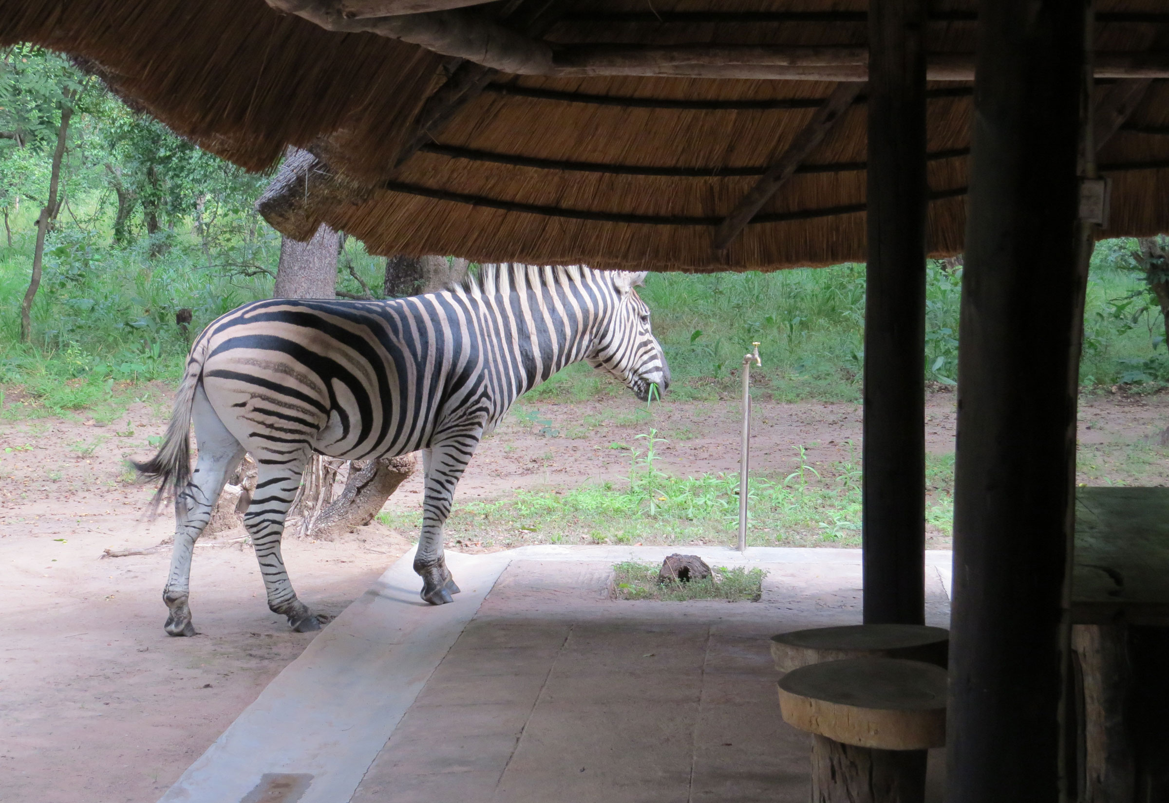 Das Gelände in Kuti ist weitläufig und man kann Fahrräder mieten. Wir sollten eigentlich zelten. Da es aber Nebensaison ist und wir nur eine kleine Gruppe sind, bekommen wir zwei große Villen, die jeweils mit zwei Schlafzimmern, schicken Bädern und eine großen Küche ausgestattet sind. Was für ein Luxus! Am Nachmittag gönnen wir uns einen Amarula auf der Terrasse und schauen einer Zebraherde zu, die sich direkt neben unserer Villa genüsslich an den Bäumen schubbert. Die Tiere sind an Menschen gewöhnt und sie wissen, dass es hier auch immer Wasser gibt, also schauen sie gern vorbei. Wir haben den Campingplatz zwar nicht gesehen, es ist aber davon auszugehen, dass die sanitären Anlagen dort gut sind.