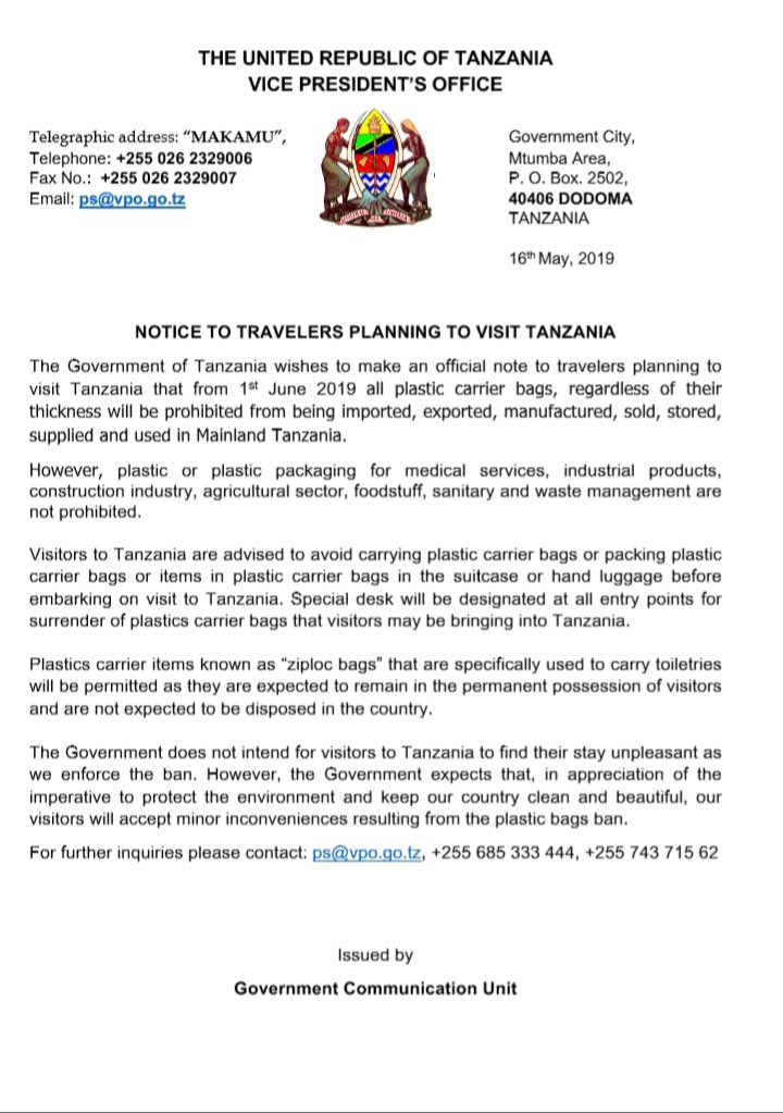 Nachdem zunächst auch Ziplocbeutel verboten wurden, hat die tansanische Regierung nun zurückgerudert, um Touristen nicht zu verärgern bzw. Unmengen von Flugzeugmüll entsorgen zu müssen. (Siehe Schreiben der Regierung am Ende des Artikels)