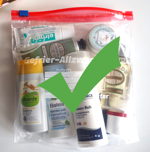 Alternativ wäre zu überlegen, ob man wirklich Flüssigkeiten im Handgepäck mitnehmen muss. Duschbad und Shampoo sind im Grunde nichts anderes als verflüssigte Seife, also können Sie auch ein Seifenstück mitnehmen. Mittlerweile gibt es auch festes Duschbad und Shampoo in vielen Drogeriemärkten.