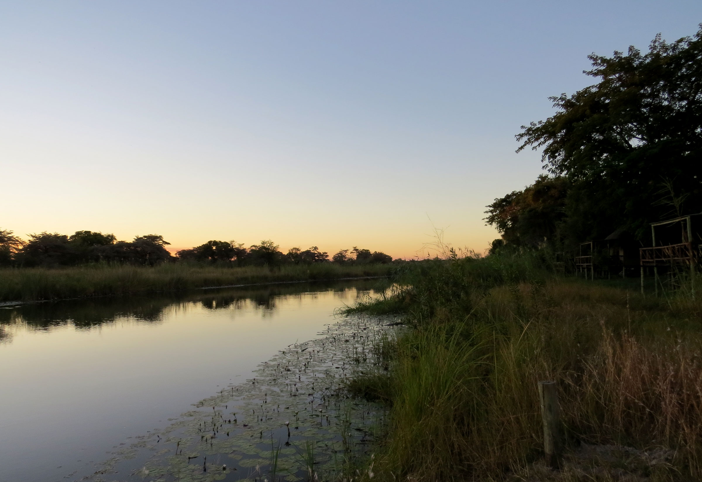 Wir sind nach zwei Grenzüberquerungen im Caprivistreifen angekommen und drehen am Nachmittag eine Runde durch den kleinen Susuwe Nationalpark, bevor es zum Camp Kwando am gleichnamigen Fluss geht. Die deutsche Managerin Anke begrüßt uns sehr herzlich. Das Camp verfügt über 13 Zeltchalets, die in zwei Reihen mit Blick auf den Fluss angeordnet sind. Sie sind fest auf Holzplattformen errichtet und haben Reetdächer. Sechs weitere, fest gebaute Chalets und ein Campingplatz verteilen sich auf dem weitläufigen Gelände. Es ist sehr grün hier, überall wachsen Bäume und Blumen. Zwischen dem Haupthaus und den Chalets kommt man am Pool vorbei. Er sieht sehr einladend aus, das Wasser ist jedoch trotz Sonne sehr kalt. Anke erzählt uns später, dass es gestern Morgen nur +4 Grad Lufttemperatur hatte und der Pool im Winter nicht genug Sonne bekommt, um sich aufzuheizen. Das gesamte Camp wird durch Solarenergie versorgt, eine Dusche am frühen Morgen ist also auch ein sehr erfrischendes Erlebnis. Winter in Afrika eben.