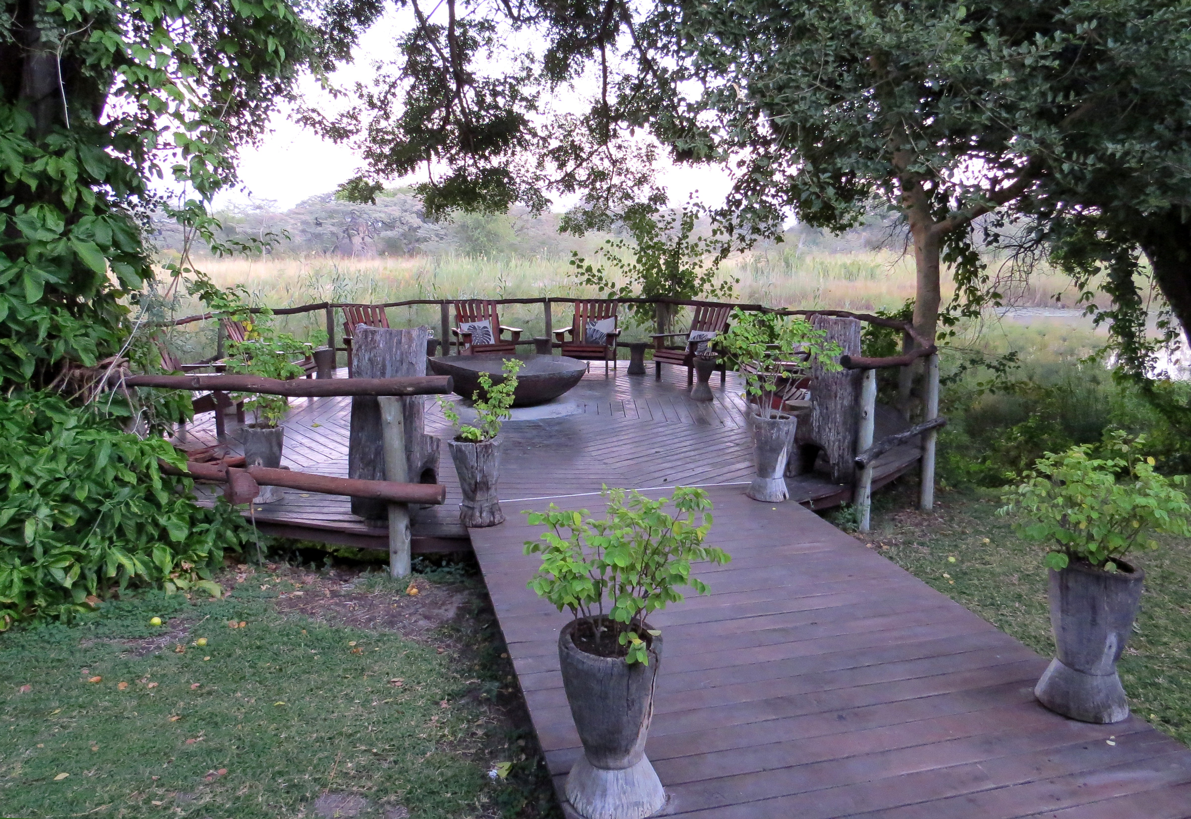Im Hauptbereich gibt es natürlich eine Bar und ein offenes Restaurant. Besonders schön sind zwei Aussichtsterrassen mit Blick auf den Fluss, eine davon mit einer Lagerfeuerstelle. Die andere kann für private Mahlzeiten genutzt werden. Im Camp gibt es zwei „Resident Owls“, die bei einbrechender Dunkelheit an die Vogeltränke kommen. Verärgern sollte man die Eulen allerdings nicht, sie verteidigen ihr Revier auch mit ihren Klauen und Schnäbeln. Es gibt hier Bienenfresser, Kingfisher und andere bunte Vögel. In den Bäumen turnen auch putzige Baumhörnchen herum. Auf Schildern wird vor Krokodilen und Flusspferden gewarnt. Die Hippos hören wir lautstark nachts grunzen, die Krokodile lassen sich jedoch nicht blicken.