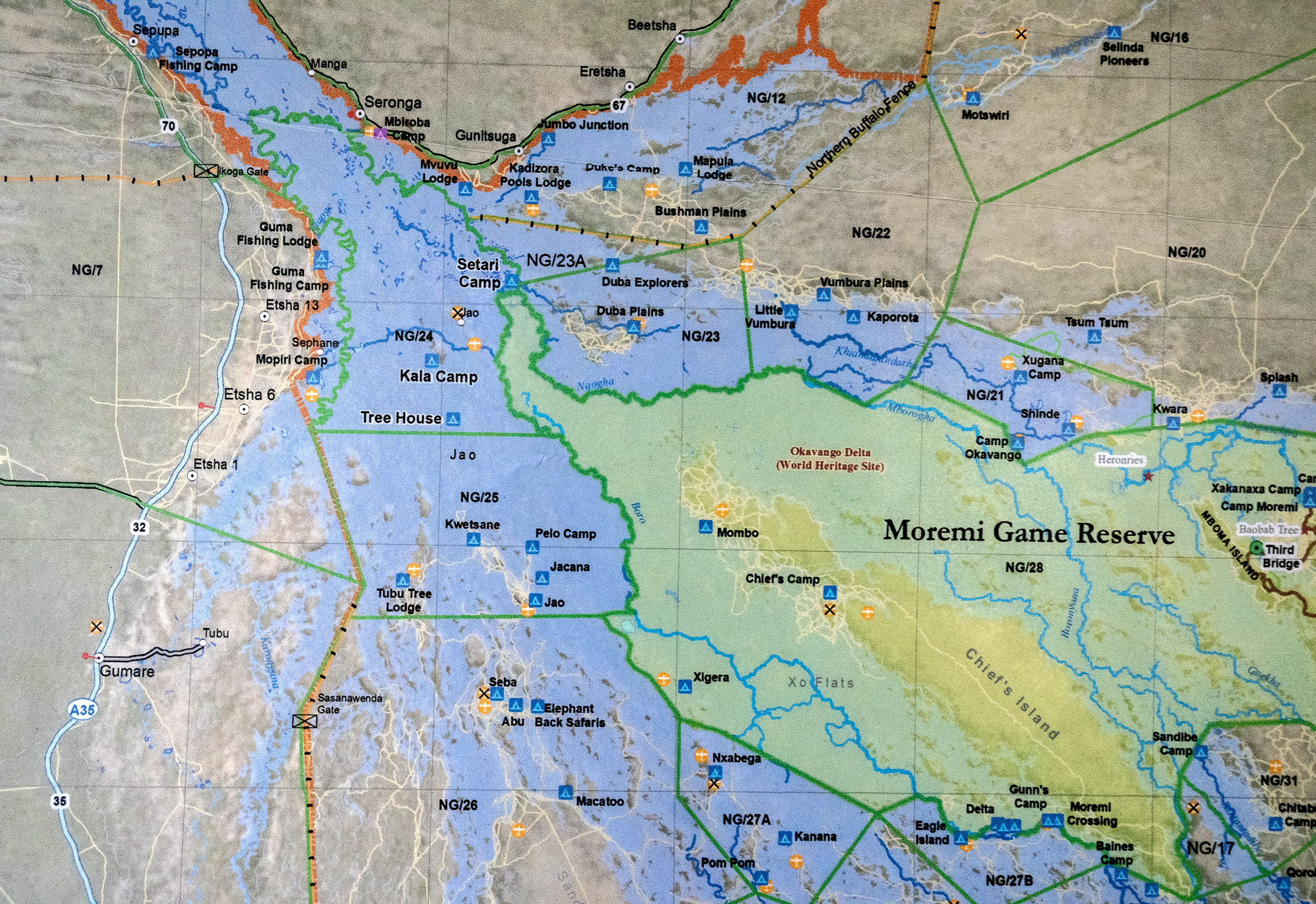 Nach Leoparden, Löwen und anderem Großwild in verschiedenen Safari-Gebieten Botswanas, sollen heute Nachmittag die Vögel im Vordergrund stehen. Wir sind im Kala Camp im hohen Norden des Okavango-Deltas. Etwa Mai von bis August ist der größte Teil dieser Gegend überschwemmt. Nur vereinzelt schauen Inseln mit hohen Palmen aus den riesigen, natürlichen Seerosenteichen heraus. Jetzt am Ende der Trockenzeit ist das Wasser weit zurückgegangen. Aber Bootsfahrten und Mokoro-Ausflüge sind hier weiterhin möglich.