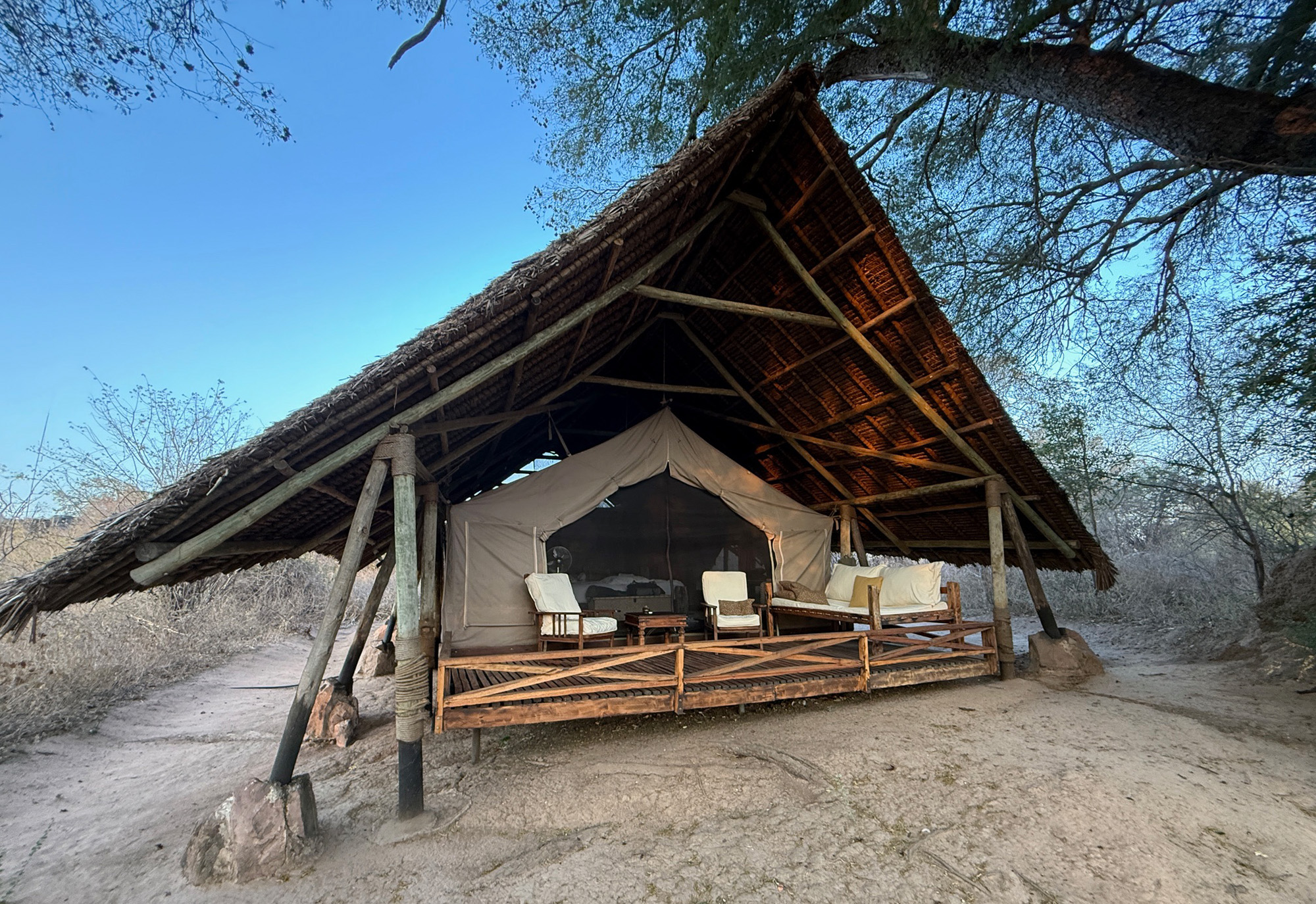 Die Fahrt zum Jongomero Camp dauert nicht lange und wir werden sehr herzlich mit Gesang empfangen. Ein über tausend Jahre alter Boabab-Baum steht gleich am Eingang des wunderschönen Camps. Wir haben das Zelt Nr. 1, das einen schönen Blick auf den zurzeit ausgetrockneten Fluss bietet. Wir werden in den nächsten Tagen noch oft Tiere im Flussbett und nahe an unserem Zelt sehen. Das Zelt ist wunderschön eingerichtet, hat ein großes Bad und eine schattige Terrasse, die wir nachmittags oft nutzen.