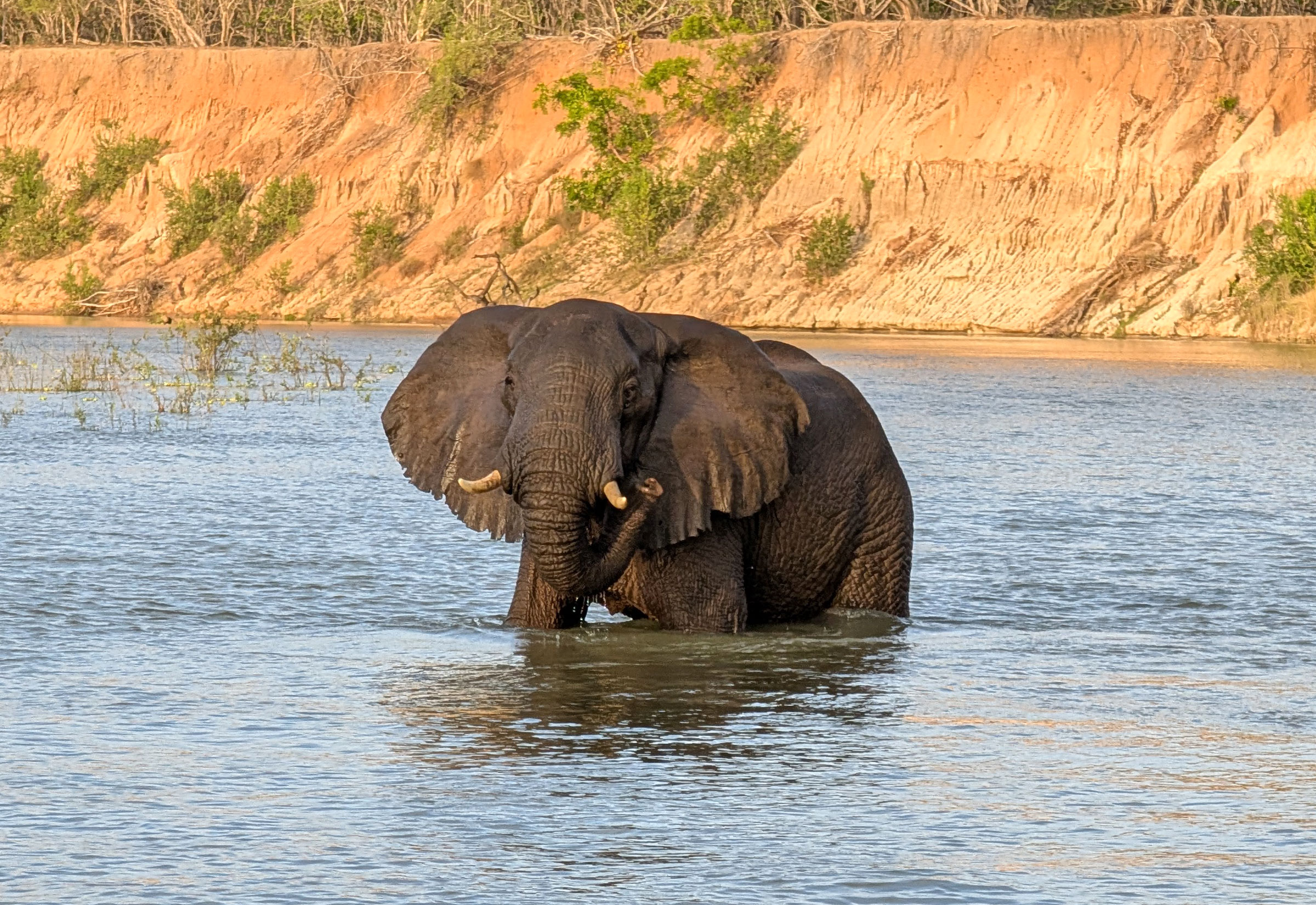 Meine erste Nacht verbrachte ich im Siwandu Camp am gleichnamigen See. Hier unternahm ich eine Bootssafari, bei der ich viele Hippos und Krokodile sah, die sich im Wasser abkühlten, was bei der Hitze auch notwendig war. Ebenso zeigten sich einige Büffel am Ufer, ich sah viele verschiedene Vogelarten und auch Elefanten, die am Flussufer gefressen haben. Dies ist immer ein besonders schönes Bild.