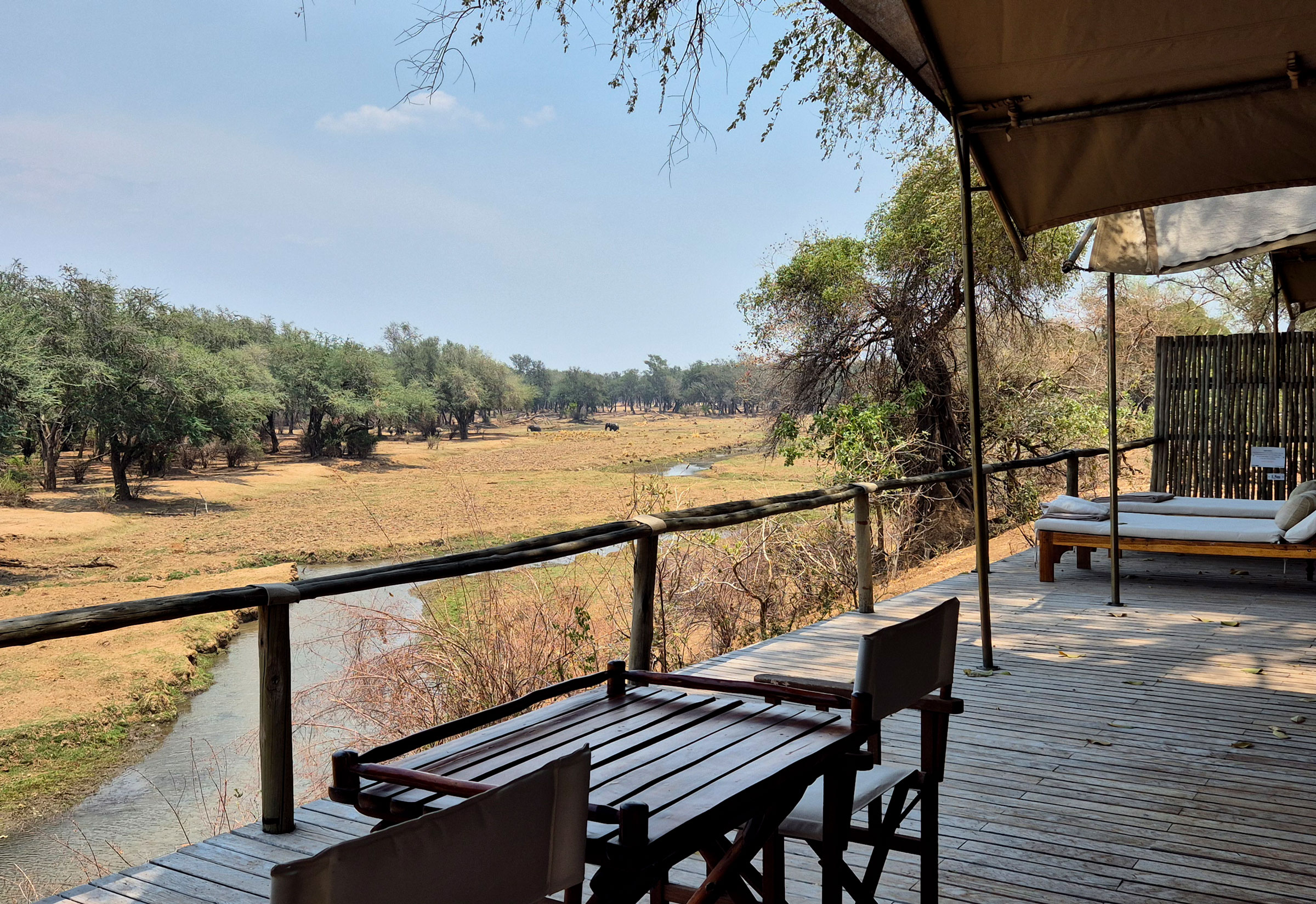 Das Camp ist nicht nur für seine luxuriösen Safarizelte bekannt, sondern auch für seine einmalige Lage mitten im Lower Zambezi Nationalpark, einem der wildesten Gebiete Sambias. Wir kommen am Vormittag an. Anabezi liegt an einer Lagune, an der sich gerade Elefanten und Krokodile tummeln. Mein Zelt übertrifft alle Erwartungen: groß und luftig, ausgestattet mit allem, was man braucht.