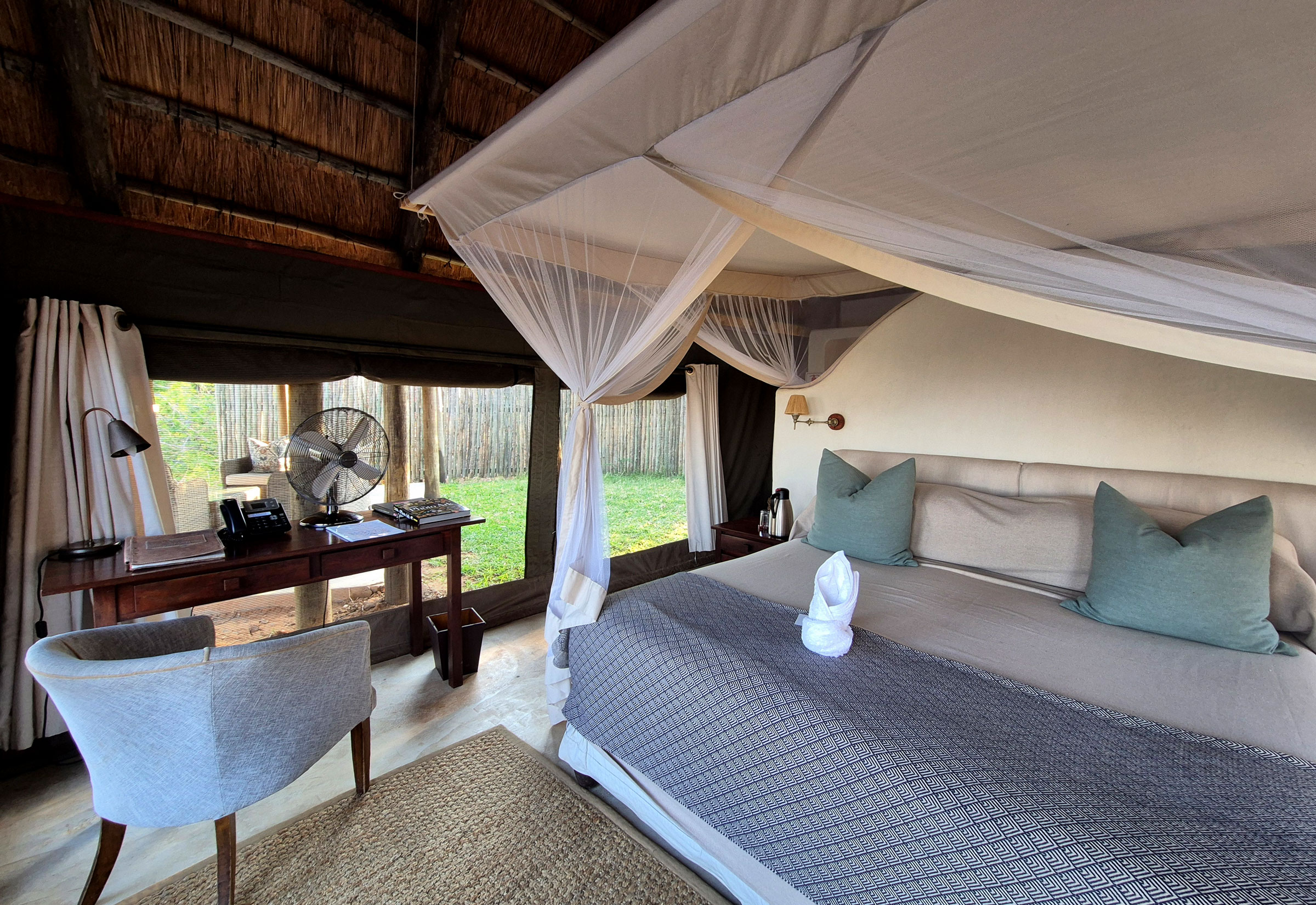 Zwar hat die Lodge viele Treppen und ist nicht behindertengerecht, aber der Ausblick auf den Fluss entschädigt für alles. Besonders aufregend war, dass hier noch Bootsfahrten möglich sind, während der Wasserstand weiter flussaufwärts zu niedrig ist. Neben den Bootsausflügen bietet die Lodge auch Pirschwanderungen, Pirschfahrten und Angeln an. In der kommenden Green Season wird sogar ein Familienappartement gebaut, in dem zwei Zimmer durch ein Deck verbunden werden – ideal für Familien, da Kinder jeden Alters willkommen sind.
