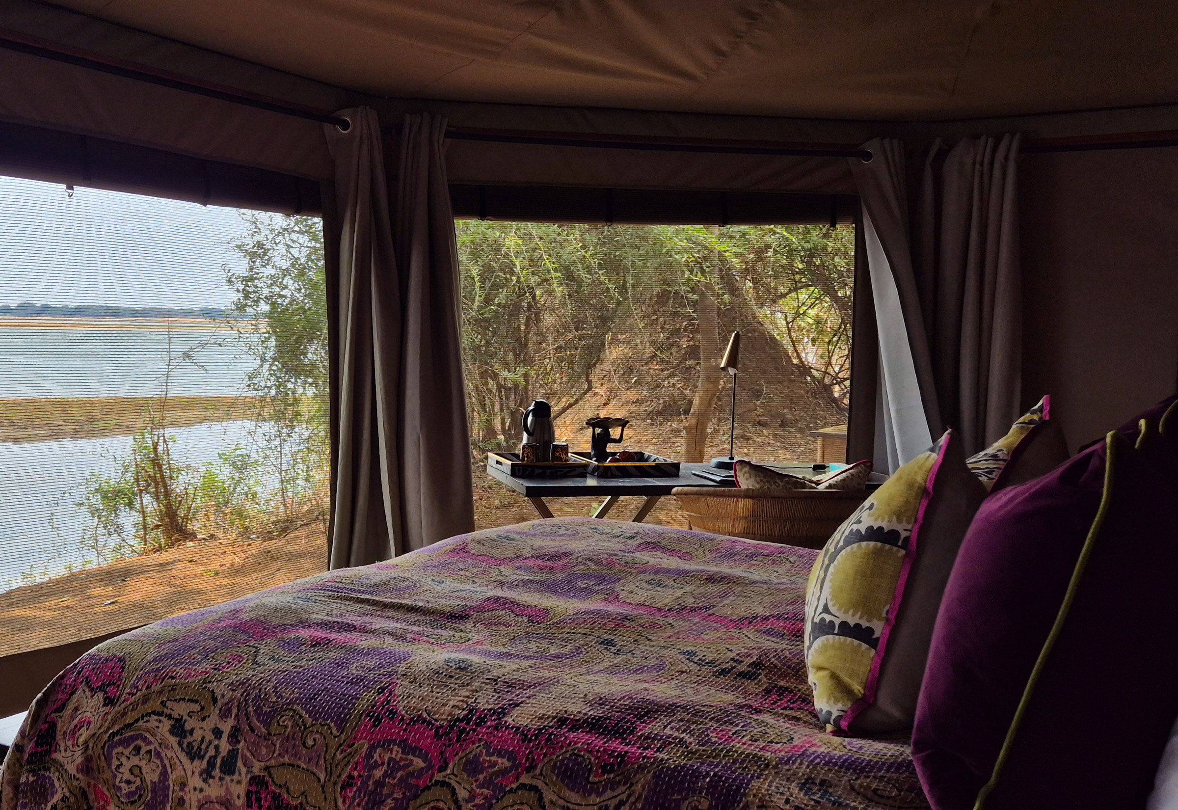 Auf der Terrasse halte ich kurz inne und lasse den Blick über den Fluss schweifen. Ein Flusspferd taucht am Ufer auf und verschwindet wieder im Wasser. Die Zelte verteilen sich entlang der Lagune, alle so platziert, dass man eine gute Sicht hat. Ich merke schnell, dass man hierher nicht nur kommt, um Tiere zu beobachten, sondern auch, um die Ruhe der Natur und vor allem den Luxus der Zelte zu genießen.