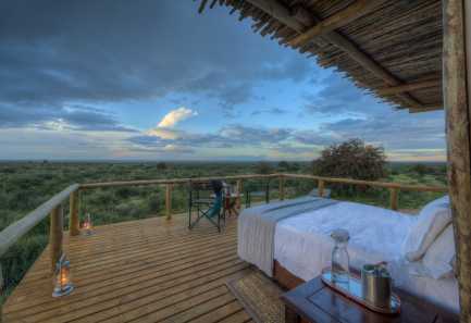 Schöne Zeltodge am Hang eines kleinen Berges mit herrlicher Aussicht über das Savutigebiet.