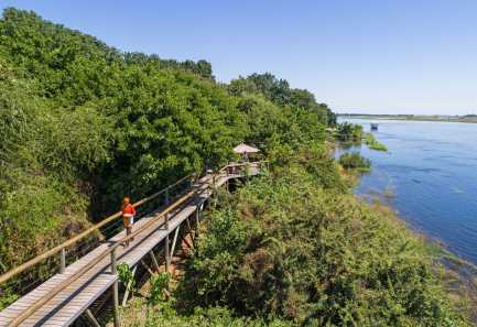 An den Ufern des Chobe und des mächtigen Sambesi tummeln sich nicht nur zahlreiche Tiere, sondern es gibt hier auch luxuriöse Lodges an Land und auf dem Wasser.