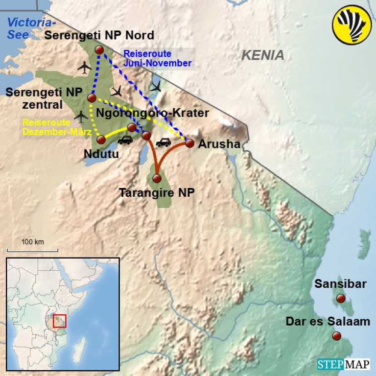 Dieser Reisebaustein bildet das Herzstück einer kompakten Safari im nördlichen Tansania und kann mit vielen anderen Bausteinen oder Reisekomponenten individuell kombiniert und verlängert werden, z.B. Safari in Kenia oder Südtansania, Kilimanjaro-Besteigung, Badeurlaub auf Sansibar.
