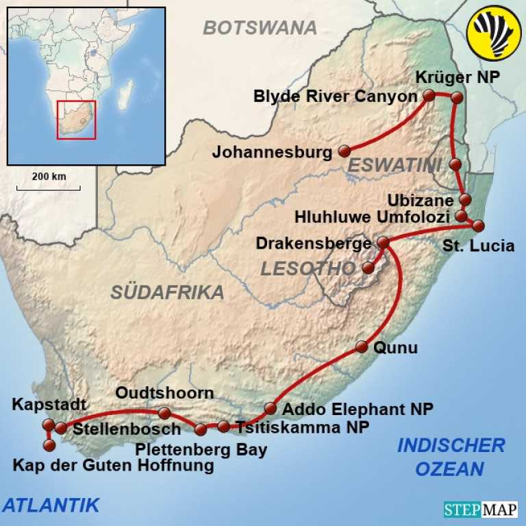 Diese Reise führt zu den Höhepunkten entlang der Garden Route. Sie besuchen die vielleicht schönste Stadt der Welt, Kapstadt, mit dem weit sichtbaren Tafelberg. Faszinierenden Landschaften erwarten Sie: raue Küsten und malerische Buchten, fruchtbare Täler und trockene Halbwüsten, hohe Berge und Weinhänge. Von Juli bis November können Sie oft Wale nahe der Küste sehen. In malariafreien Wildparks leben die „Big Five“: Elefanten, Löwen, Leoparden, Nashörner und Büffel.