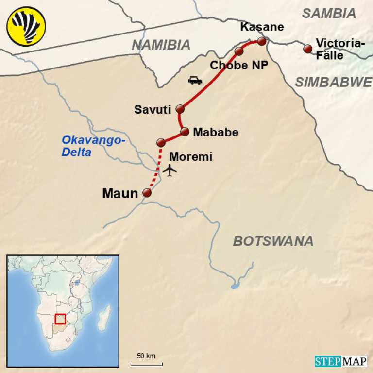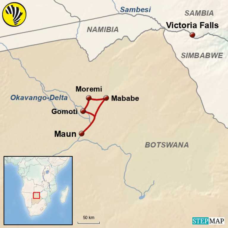 In Botswana reihen sich die Safarihöhepunkte wie eine Perlenkette aneinander. Beginnend an den Victoriafällen reisen Sie vom Elefantenparadies Chobe über die tierreiche Savanne von Moremi und Savuti bis tief hinein ins Herz des Okavango-Deltas.