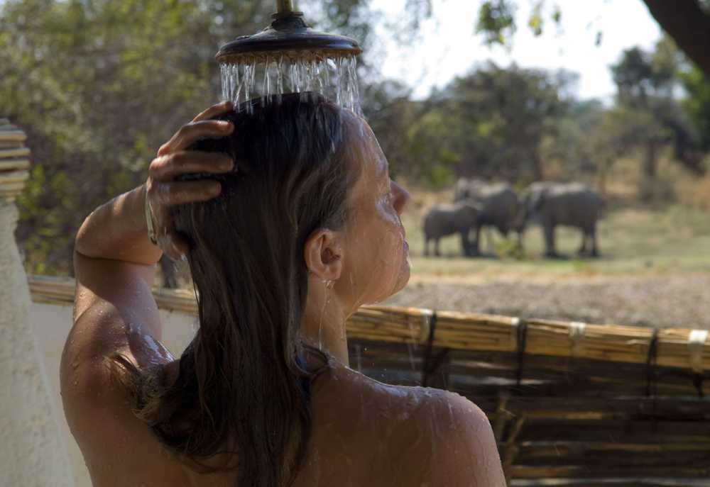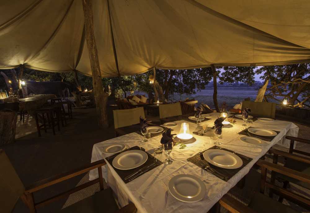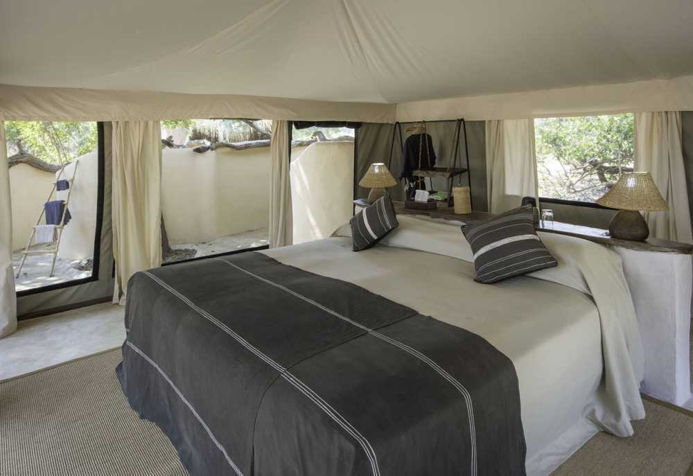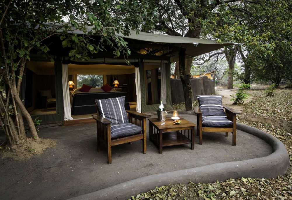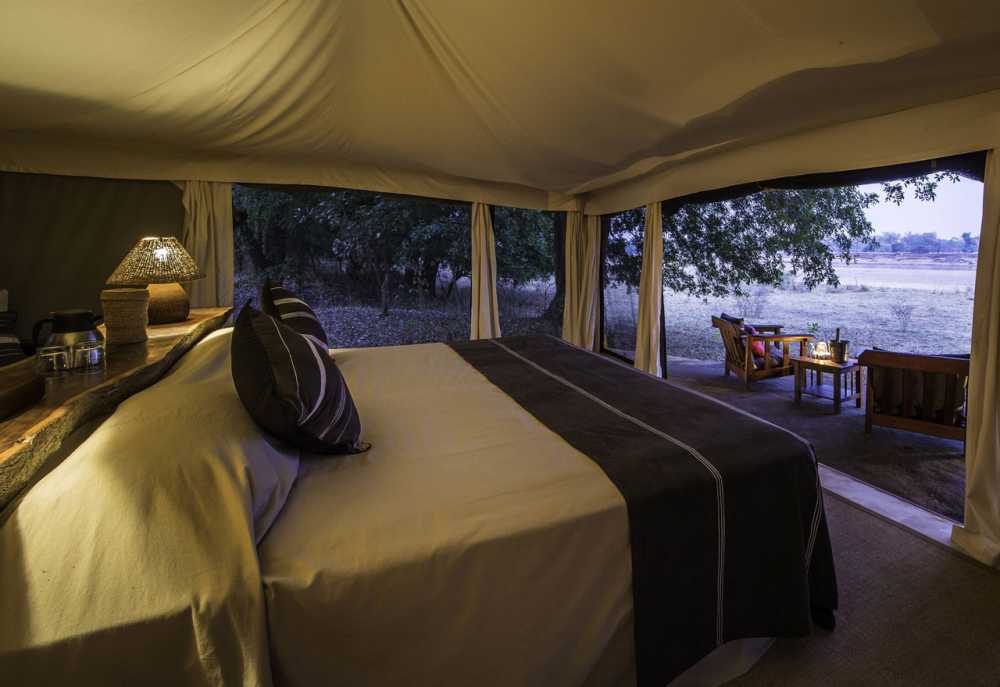 Im Schatten großer Mahagoni- und Leberwurstbäume stehen fünf geräumige und komfortabel ausgestattete Safari-Zelte, die Platz und viel Privatsphäre für bis zu zehn Gäste bieten. Die Zeltwände sind geschickt zwischen Baumstämme gebaut. Von der privaten Veranda und - bei geöffneten Zeltbahnen - auch vom Bett aus blicken Sie auf den Luangwa. Es gibt ein kleines Ankleidezimmer und ein großes Open Air Badezimmer mit Dusche und Spültoilette an. Vom zentralen Speise- und Lounge-Bereich sehen Sie auf den Luangwa hinab, in dem sich die Flusspferde tummeln.