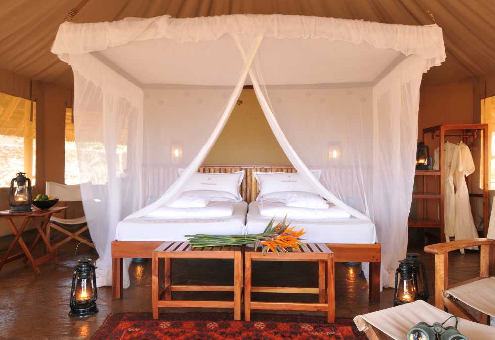 Das Camp unter deutschsprachigem Management bietet guten Komfort und zuvorkommenden, freundlichen Service mitten in der afrikanischen Wildnis. Die 21 achteckigen Zelte sind mit fließend Warm- und Kaltwasser, Dusche, separater Toilette und Bidet, bequemen Betten mit Moskitonetz und privater Terrasse ausgestattet und geschmackvoll dekoriert. Jedes Zelt verfügt über 220V Elektrizität, Föhn, Safe und kostenfreien W-LAN Zugang. Von den Zelten aus bietet sich ein schöner Blick auf die Landschaft und das Wild, das von einem Wasserloch gleich neben der Lodge angezogen wird. Daneben gibt es noch vier aus Stein gemauerte, größere Junior Suiten mit separater Sitzecke, einem Sonnendeck mit Liegen und einem privaten Innenhof mit Außendusche, sowie zwei luxuriöse, erhöht gelegene Suiten.